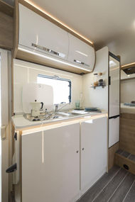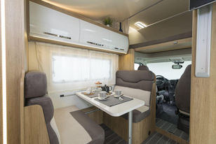 Caravan International to bliźniacza marka dla kamperów Roller Team, różniąca się w zasadzie jedynie kolorystką. Horon 95M to bardzo przestronna alkowa. Posiada 6 homologowanych miejsc do jazdy oraz 3 dwuosobowe łóżka: