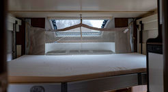 Plusem tego układu zabudowy jest toaleta i prysznic w dwóch osobnych miejscach oraz dodatkowe drzwi odgradzające część sypialną od reszty kampera.